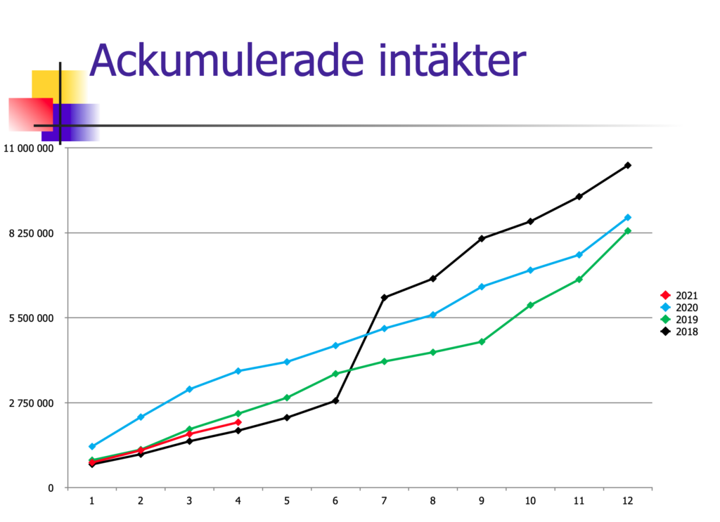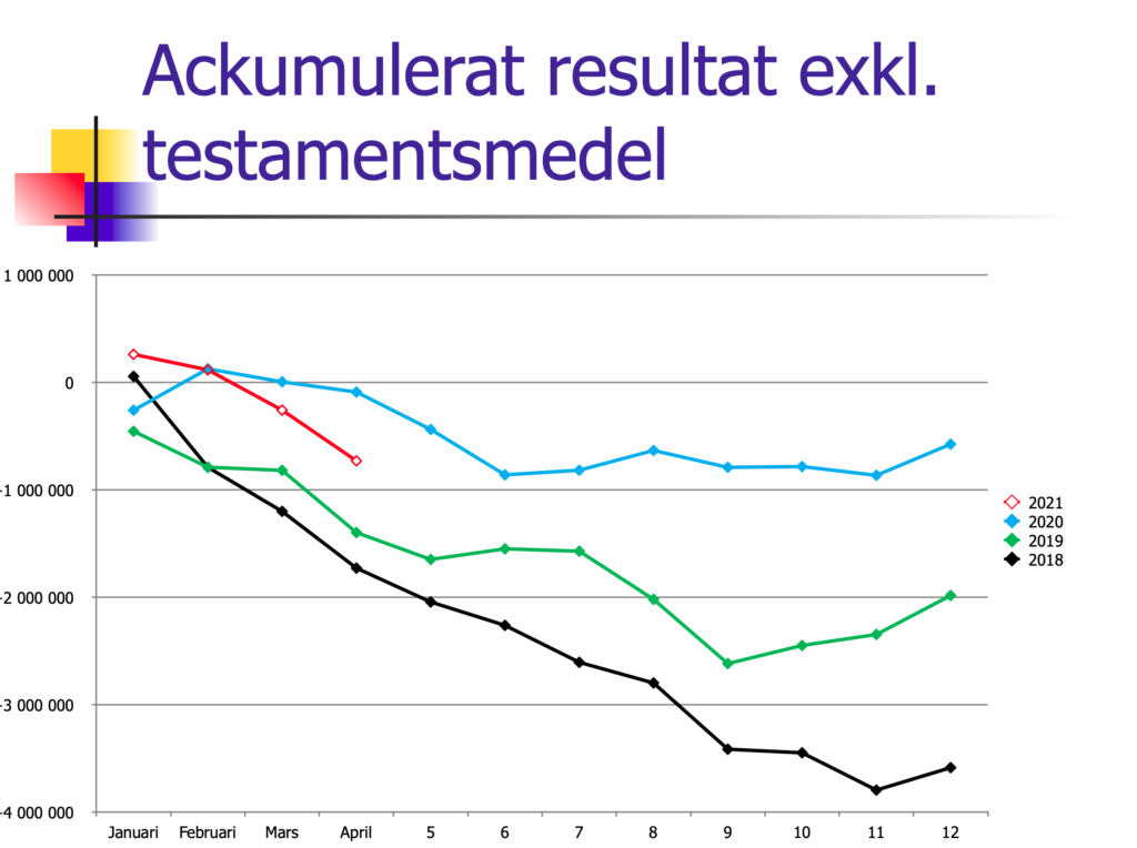 Efter de tre första månaderna av 2021 var det ekonomiska resultatet inte bra, men okej. I april tvärnitade dock gåvorna, särskilt kollekterna som bara blev 11 000 kr, samtidigt som flera planerade utbetalningar gjordes till missionsfälten. Det resulterade i en förlust på -500 000 kronor bara för april, och vi är nu -700 000 kr för hela året.