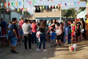 Det största evenemanget vi hade med Bibelskolan var en “feria” (tivoli) för barn i gatan utanför San Antonio krykan. Det var en insamlingen för att kunna fortsätta bygga i kyrkan. Innan ferian var det en “pollada” där alla blev imponerad av den goda kycklingen vi fick äta. Vi hade förberet lekar, byggt och bett för att ferian skulle vara en välsignelse för barnen och bygget. Det blev så fint och så uppskattat! Verkligen satsigt. Någon av eleverna sa: “Ursäkta språket men… Tänk att ett så skitigt ställe kan bli så fint!” Mycket färg och lek och glada barn på grusgatan. Även ordningsvakterna kom och hängde i deras bil för att iaktta festligheterna.