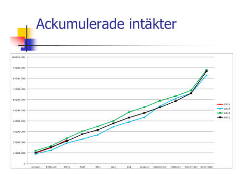 Första kvartalet 2025 ligger i paritet med föregående år. Se röd kurva.