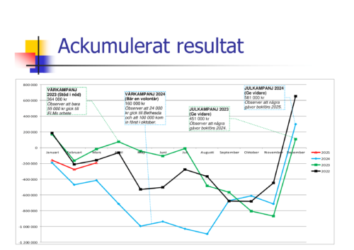 Ett årsbokslut för 2024 hade vi på bordet och ledamöterna undertecknade detta med glädje. För tredje året i rad får vi se ett plusresultat, denna gång på 299 207 kr. Dessa återkommande plusresultat gör att vi har stärkt det egna kapitalet till en tillfredsställande nivå, vilket vi varmt och innerligt tackar alla våra givare för. Framför allt tackar vi Gud för att han kallar givare och bedjare i Hans rike. Låt oss be om arbetare i skörden för fortsatt omsättning av pengar till missionsarbete.