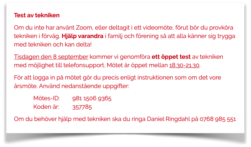 Du kan logga in när du vill under kvällen, och om du behöver hjälp är det möjligt att ringa Daniel Ringdahl (0768 985 551) för hjälp. Se information nedan om hur du kommer in i testmötet. Här kan du ladda ner instruktionen för Zoom och informationen om hur vi kommer att genomföra det digitala årsmötet.